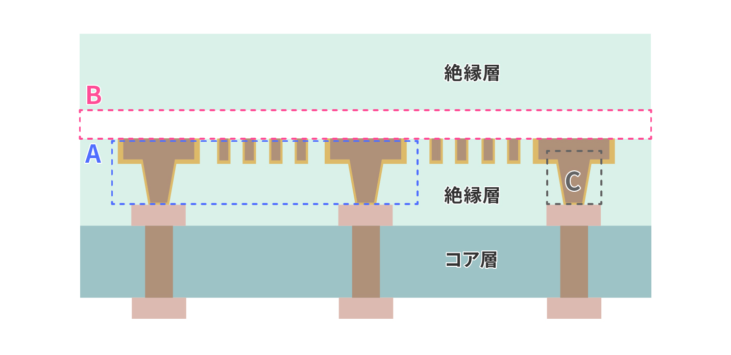 配線が絶縁層に埋め込まれているため、配線折れや有機絶縁膜の充填不足のリスクを低減可能です。C【高テーパー】