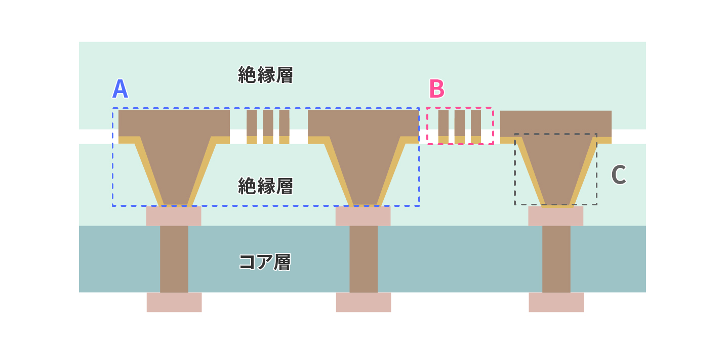 ラミネート時の配線折れ・剥離や有機絶縁膜の充填不足リスクが高まるため、微細配線の形成が困難C【レーザードリルの加工精度】
