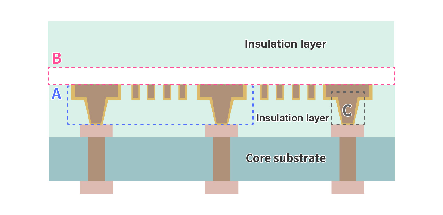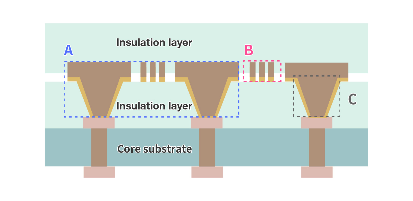 Shin-Etsu excimer laser equipment can achieve high accuracy of processing both vias and traces.B【Embedded trace】