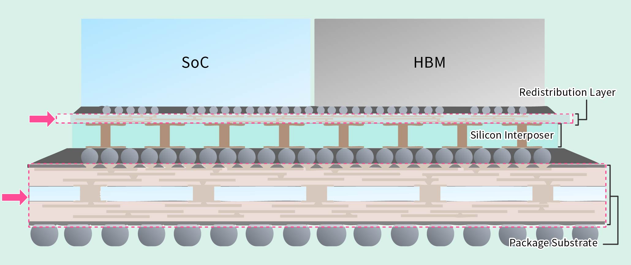 “Chiplet” technology attracts attention to support enhancement of high functionality in IC package and cost reduction. Silicon interposer is commonly used for inter-connection of chiplets in advanced IC package, while facing issues such as enlargement of package size, lower yield, higher cost.